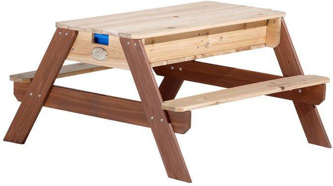 De Nick Zand & Water Picknicktafel Bruin van AXI is een multifunctionele picknicktafel. Nick heeft onder het afneembare tafelblad een verborgen ruimte met twee blauwe bakken. Deze blauwe bakken kunnen gevuld worden met zand en/of water,.