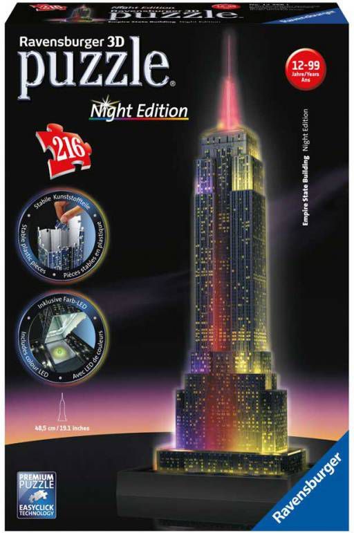 Uniek drie dimensionaal puzzelplezier, dat zijn de 3D gebouwen puzzels van Ravensburger. Puzzel prachtige 3D bouwwerken in elkaar en geef ze een mooi plaatsje op o.a. je wandplank of op het dressoir. De stevige plastic stukjes passen precies in elkaar. Zo bouw je vanuit gebogen, platte en vouwbare stukjes een uniek model van de Empire State Building bij nacht, zonder lijm te gebruiken.Dit product is geschikt voor kinderen vanaf 12Âjaar.Â.