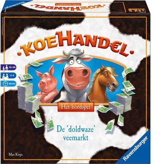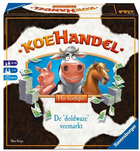 Spring in je klompen en op naar de veemarkt met Koehandel Het bordspel! Boer zoekt koe! Hier vind je alles wat het onstuimige boerenhart begeert: dieren, veilingen en wat al niet meer! Haal je medespelers bij de koehandel flink het vel over de neus! Manipuleer de marktprijs van de dieren en beproef je geluk in de loterij! In het spel voor beginners is het met een beetje boerenverstand al meteen goed boeren.