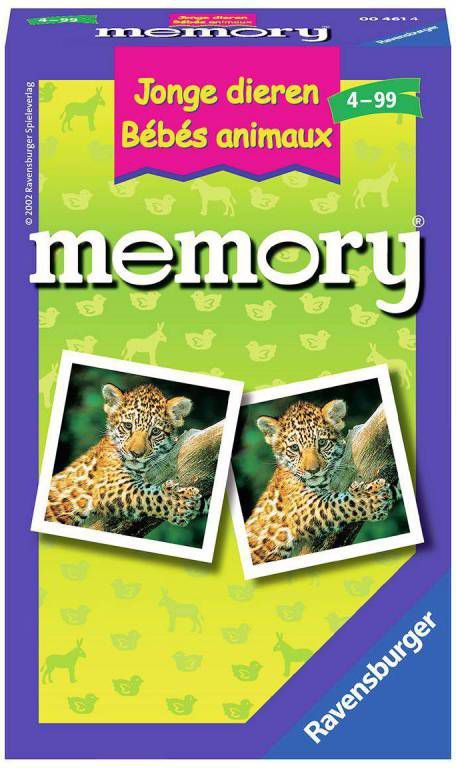 memory van Ravensburger is al meer dan 50 jaar het meest geliefde eerste spel dat een kind met andere spelen kan... Door de grote kaarten van extra dik karton is deze memory met afbeeldingen van Jonge dieren al geschikt voor de allerkleinsten. Leeftijd vanaf 4 jaar 2-8 spelers.