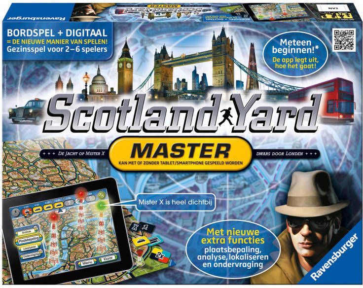 Speel Scotland Yard Master van Ravensburger en maak gebruik van de modernste techniek voor de jacht op Mister X in de plaats delict: Londen. De gratis app maakt van de smartphone of tablet van de detectives een digitale regelkamer moderne opsporingsmethoden van analyse tot plaatsbepaling helpen mee Mister X op het spoor te komen! Maar ook Mister X is moderner geworden met de per app bestuurde helikopter gebruikt hij een nieuw vervoermiddel! De innovatieve combinatie van bordspel-klassieker en digitaal speelplezier garandeert een spannend avontuur. Scotland Yard Master Meer pep door de app!.