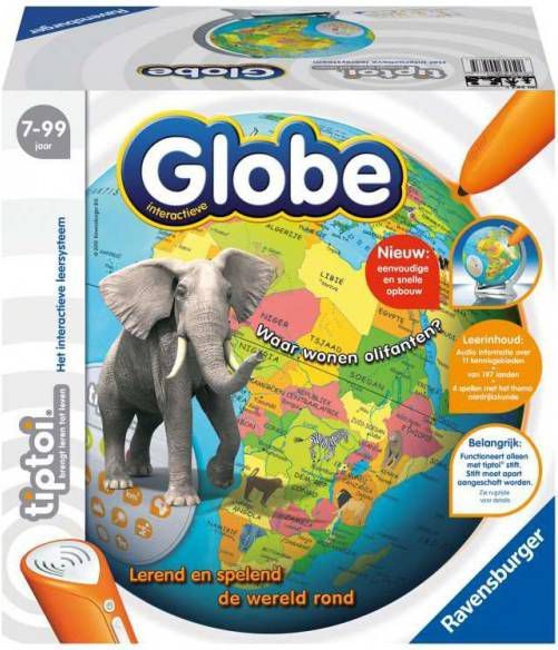 Met de Tiptoi Interactieve Globe van Ravensburger verken je al spelend de wereld. Krijg audio informatie over 11 kennisgebieden van 197 landen van de wereld en leer nog meer tijdens de spannende spellen voor maximaal vier spelers. In een reis rond de wereld geeft de tiptoi allerlei informatie en spannende verhalen over thema's als geografie, landgrootte, hoofdsteden en nog veel meer. Tiptoi is het interactieve leersysteem voor boeken, spellen en puzzels van Ravensburger. Het is een innovatief leersysteem waarmee kinderen spelenderwijs de wereld ontdekken. Als je kind met de stift op een afbeelding of tekst tipt, klinken er bijbehorende geluiden, gesproken tekst of muziek. De elektronische intelligentie biedt kinderen de mogelijkheid om boeken en spellen helemaal zelfstandig steeds weer opnieuw te beleven.